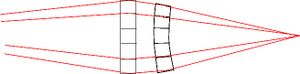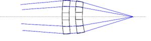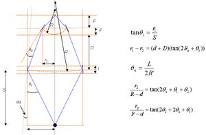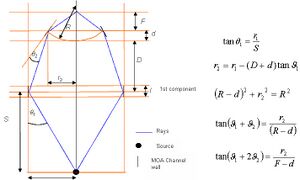 MOAs are achromatic (which means the focal properties do not change for radiation of different wavelengths) as they utilize grazing incidence reflection. This means that they are able to focus chromatic radiation to a common point unlike zone plates. MOAs are also adjustable as the optic can be compressed to alter the focal properties such as focal length. Focal length can be calculated for the system in fig. 1 using the geometry shown in fig. 2 where it can be seen that changing the gap between the components (d+D in the figure) or the radius of curvature (R) will have a large effect on the focal length.