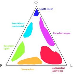 All sandstones are composed of the same general minerals. These minerals make up the framework components of the sandstones. Such components are quartz, feldspars,[8] and lithic fragments. Matrix may also be present in the interstitial spaces between the framework grains.[4] Below is a list of several major groups of sandstones. These groups are divided based on mineralogy and texture. Even though sandstones have very simple compositions which are based on framework grains, geologists have not been able to agree on a specific, right way, to classify sandstones.[4] Sandstone classifications are typically done by point-counting a thin section using a method like the Gazzi-Dickinson Method. The composition of a sandstone can have important information regarding the genesis of the sediment when used with a triangular Quartz, Feldspar, Lithic fragment (QFL diagrams). Many geologists, however, do not agree on how to separate the triangle parts into the single components so that the framework grains can be plotted.[4] Therefore, there have been many published ways to classify sandstones, all of which are similar in their general format.