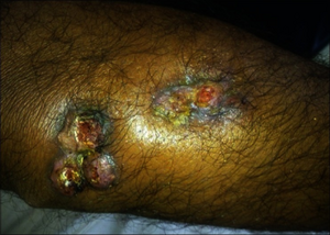 | Multiple erythematous nodules and plaque with discharge over the right elbow joint | |
