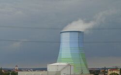 All thermal power plants produce waste heat energy as a byproduct of the useful electrical energy produced. The amount of waste heat energy equals or exceeds the amount of energy converted into useful electricity[clarification needed]. Gas-fired power plants can achieve as much as 65% conversion efficiency, while coal and oil plants achieve around 30–49%. The waste heat produces a temperature rise in the atmosphere, which is small compared to that produced by greenhouse-gas emissions from the same power plant. Natural draft wet cooling towers at many nuclear power plants and large fossil-fuel-fired power plants use large hyperboloid chimney-like structures (as seen in the image at the right) that release the waste heat to the ambient atmosphere by the evaporation of water.