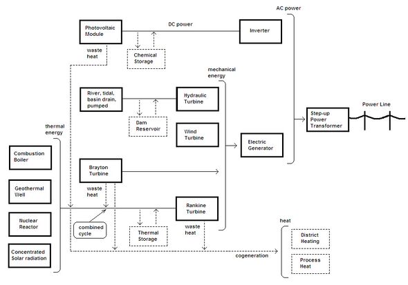 A solar photovoltaic power plant converts sunlight into direct current electricity using the photoelectric effect. Inverters change the direct current into alternating current for connection to the electrical grid. This type of plant does not use rotating machines for energy conversion.[19]