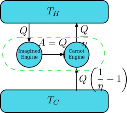 Suppose there is an engine violating the Kelvin statement: i.e., one that drains heat and converts it completely into work (the drained heat is fully converted to work) in a cyclic fashion without any other result. Now pair it with a reversed Carnot engine as shown by the right figure. The efficiency of a normal heat engine is η and so the efficiency of the reversed heat engine is 1/η. The net and sole effect of the combined pair of engines is to transfer heat [math]\displaystyle{ \Delta Q = Q\left(\frac{1}{\eta}-1\right) }[/math] from the cooler reservoir to the hotter one, which violates the Clausius statement. This is a consequence of the first law of thermodynamics, as for the total system's energy to remain the same; [math]\displaystyle{ \text{Input}+\text{Output}=0 \implies (Q + Q_c) - \frac{Q}{\eta} = 0 }[/math], so therefore [math]\displaystyle{ Q_c=Q\left( \frac{1}{\eta}-1\right) }[/math], where (1) the sign convention of heat is used in which heat entering into (leaving from) an engine is positive (negative) and (2) [math]\displaystyle{ \frac{Q}{\eta} }[/math] is obtained by the definition of efficiency of the engine when the engine operation is not reversed. Thus a violation of the Kelvin statement implies a violation of the Clausius statement, i.e. the Clausius statement implies the Kelvin statement. We can prove in a similar manner that the Kelvin statement implies the Clausius statement, and hence the two are equivalent.