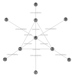 This model assumes that there are two classes of nodes. The first consists of a cohesive core sub-graph in which the nodes are highly interconnected, and the second is made up of a peripheral set of nodes that is loosely connected to the core. In an ideal core–periphery matrix, core nodes are adjacent to other core nodes and to some peripheral nodes while peripheral nodes are not connected with other peripheral nodes (Borgatti & Everett, 2000, p. 378). This requires, however, that there be an a priori partition that indicates whether a node belongs to the core or periphery.