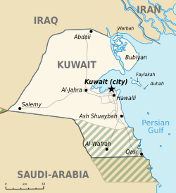 The State of Kuwait is an Arab state at the very tip of the Persian Gulf and wedged into Iraq. It's not too big, and its land is primarily harsh desert sand. The important part is what's underneath that sand: shitloads of oil. Its capital is Kuwait City.