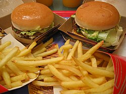 Fast food refers to tasty, high in calorie content ready-to-serve food that you get from the stores of Burger King, KFC, McDonald's, Chick-fil-A, In-N-Out Burger etc. It is popular among busy people. Fast foods are notorious for being rich in trans fat (though some restaurants are beginning to stop using it)[1] content and spreading obesity and type 2 diabetes.[1] There has also been reported a higher risk in stroke occurrences with regular fast food customers, but this could also be due to other factors, such as lack of exercise.[2]