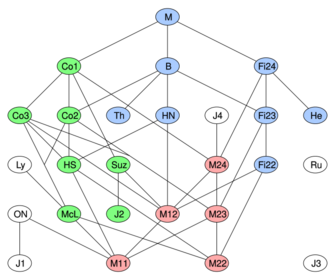 Of the 26 sporadic groups, 20 can be seen inside the monster group as subgroups or quotients of subgroups (sections). These twenty have been called the happy family by Robert Griess, and can be organized into three generations.[6][lower-alpha 3]