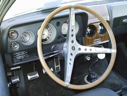 The AMX's full second model year saw only slight changes, except for a $52 increase in its base price.[9] The five-spoke Magnum 500 steel road wheels were no longer chrome plated, but now came with a stainless steel trim ring. The racing stripes were now available in five colors. The interior featured a revised instrumentation with the 0–8000 rpm tachometer moved to match the speedometer that was now calibrated to 140 mph (230 km/h). Interior door panels were revised, carpeting was upgraded, new leather upholstery was optional, and the gas pedal became suspended.[55] Later production cars received a hood over the instruments in front of the driver. Trunk capacity was 9.7 cubic feet (275 L).[56]