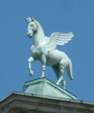 Pegasus (Greek: Πήγασος, translit. Script error: The function "transl" does not exist.; Latin: Pegasus, Pegasos) is a winged horse in Greek mythology, usually depicted as a white stallion. He was sired by Poseidon, in his role as horse-god, and foaled by the Gorgon Medusa. Pegasus was the brother of Chrysaor, both born when their mother was decapitated by Perseus. Greco-Roman poets wrote about his ascent to heaven after his birth and his obeisance to Zeus, who instructed him to bring lightning and thunder from Olympus.
