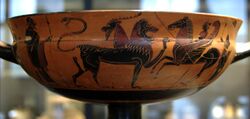 ![]() Bellerophon riding Pegasus and slaying the Chimera, central medallion of a Gallo-Roman mosaic from Autun, Musée Rolin, 2nd to 3rd century AD. | |