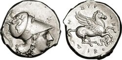 According to early myths, everywhere the winged horse struck his hoof to the earth, an inspiring water spring burst forth. One of these springs was upon the Muses' Mount Helicon, the Hippocrene ("horse spring").[5] Antoninus Liberalis has suggested,[6] that it was opened at the behest of Poseidon to prevent the mountain swelling with rapture at the song of the Muses. Another spring associated with Pegasus was at Troezen.[7] Hesiod relates how Pegasus was peacefully drinking from a spring when the hero Bellerophon captured him.