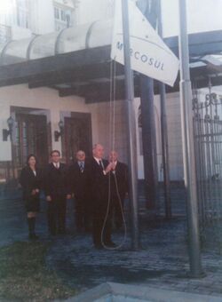 Mercosur was finally established in 1991 by the Treaty of Asunción, based on the Buenos Aires Act, the Treaty of Asunción defined rules and conditions for the creation of a free trade zone among its four signatories. Likewise, it was decided that all measures for the construction of the common market should be completed by 31 December 1994 with the amendment of the Treaty of Ouro Preto.[16] In 2001, celebrating the 10th anniversary of the bloc's creation, the Mercosur flag was hoisted for the first time at Mercosur's headquarters in Montevideo.