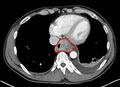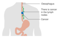 Additional testing is needed to assess how much the cancer has spread (see § Staging, below). Computed tomography (CT) of the chest, abdomen and pelvis can evaluate whether the cancer has spread to adjacent tissues or distant organs (especially liver and lymph nodes). The sensitivity of a CT scan is limited by its ability to detect masses (e.g. enlarged lymph nodes or involved organs) generally larger than 1 cm.[43][44] Positron emission tomography is also used to estimate the extent of the disease and is regarded as more precise than CT alone.[45] PET/MR as a novel modality has shown promising results in preoperative staging with fair feasibility and good correlation in comparison to PET/CT. It can enhance tissue differentiation with lowering the radiation dose to the patient.[46] Esophageal endoscopic ultrasound can provide staging information regarding the level of tumor invasion, and possible spread to regional lymph nodes.