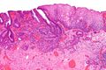 Micrograph showing histopathological appearance of an esophageal adenocarcinoma (dark blue – upper-left of image) and normal squamous epithelium (upper-right of image) at H&E staining