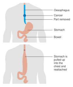 Esophagectomy is the removal of a segment of the esophagus; as this shortens the length of the remaining esophagus, some other segment of the digestive tract is pulled up through the chest cavity and interposed. This is usually the stomach or part of the large intestine (colon) or jejunum. Reconnection of the stomach to a shortened esophagus is called an esophagogastric anastomosis.[61]