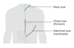 Esophagectomy can be performed using several methods. The choice of the surgical approach depends on the characteristics and location of the tumor, and the preference of the surgeon. Clear evidence from clinical trials for which approaches give the best outcomes in different circumstances is lacking.[61] A first decision, regarding the point of entry, is between a transhiatial and a transthoracic procedure. The more recent transhiatial approach avoids the need to open the chest; instead the surgeon enters the body through an incision in the lower abdomen and another in the neck. The lower part of the esophagus is freed from the surrounding tissues and cut away as necessary. The stomach is then pushed through the esophageal hiatus (the hole where the esophagus passes through the diaphragm) and is joined to the remaining upper part of the esophagus at the neck.[61]