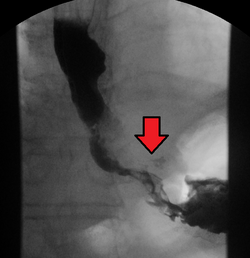 The long-term erosive effects of acid reflux (an extremely common condition, also known as gastroesophageal reflux disease or GERD) have been strongly linked to this type of cancer.[26] Longstanding GERD can induce a change of cell type in the lower portion of the esophagus in response to erosion of its squamous lining.[26] This phenomenon, known as Barrett's esophagus, seems to appear about 20 years later in women than in men, possibly due to hormonal factors.[26] At a mechanistic level, in the esophagus there is a small HOXA13 expressing compartment that is more resistant to bile and acids as the normal squamous epithelium and that is prone to both intestinal differentiation as well as oncogenic transformation. Following GERD this HOXA13-expressing compartment outcompetes the normal squamous compartment, leading to the intestinal aspect of the esophagus and increased propensity to the development of esophageal cancer.[27] Having symptomatic GERD or bile reflux makes Barrett's esophagus more likely, which in turn raises the risk of further changes that can ultimately lead to adenocarcinoma.[16] Bile reflux containing unconjugated bile acids, including deoxycholic acid and chenodeoxycholic acid, appears to contribute to esophageal adenocarcinoma carcinogenesis by inducing oxidative stress and DNA damage[28].The risk of developing adenocarcinoma in the presence of Barrett's esophagus is unclear, and may in the past have been overestimated.[2]