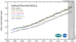 Based on the first high frequency, high precision, in situ atmospheric and archived air measurements, sulfuryl fluoride has an atmospheric lifetime of 30–40 years,[8] much longer than the 5 years earlier estimated.[25]