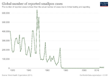The first disease people tried to prevent by inoculation was most likely smallpox, with the first recorded use of variolation occurring in the 16th century in China.[10] It was also the first disease for which a vaccine was produced.[11][12] Although at least six people had used the same principles years earlier, the smallpox vaccine was invented in 1796 by English physician Edward Jenner. He was the first to publish evidence that it was effective and to provide advice on its production.[13] Louis Pasteur furthered the concept through his work in microbiology. The immunization was called vaccination because it was derived from a virus affecting cows (Latin: vacca 'cow').[11][13] Smallpox was a contagious and deadly disease, causing the deaths of 20–60% of infected adults and over 80% of infected children.[14] When smallpox was finally eradicated in 1979, it had already killed an estimated 300–500 million people in the 20th century.[15][16][17]