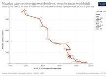 In 1974 the WHO adopted the goal of universal vaccination by 1990 to protect children against six preventable infectious diseases: measles, poliomyelitis, diphtheria, whooping cough, tetanus, and tuberculosis.[77]: 119 In the 1980s only 20 to 40% of children in developing countries were vaccinated against these six diseases. In wealthy nations the number of measles cases had dropped dramatically after the introduction of the measles vaccine in 1963. WHO figures demonstrate that in many countries a decline in measles vaccination leads to a resurgence in measles cases. Measles are so contagious that public health experts believe a vaccination rate of 100% is needed to control the disease.[77]: 120 Despite decades of mass vaccination polio remains a threat in India, Nigeria, Somalia, Niger, Afghanistan, Bangladesh and Indonesia. By 2006 global health experts concluded that the eradication of polio was only possible if the supply of drinking water and sanitation facilities were improved in slums.[77]: 124 The deployment of a combined DPT vaccine against diphtheria, pertussis (whooping cough), and tetanus in the 1950s was considered a major advancement for public health. But in the course of vaccination campaigns that spanned decades, DPT vaccines became associated with high incidences of side effects. Despite improved DPT vaccines coming onto the market in the 1990s DPT vaccines became the focus of anti-vaccination campaigns in wealthy nations. As immunization rates fell outbreaks of pertussis increased in many countries.[77]: 128