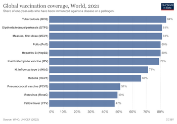 Vaccination is the administration of a vaccine to help the immune system develop immunity from a disease. Vaccines contain a microorganism or virus in a weakened, live or killed state, or proteins or toxins from the organism. In stimulating the body's adaptive immunity, they help prevent sickness from an infectious disease. When a sufficiently large percentage of a population has been vaccinated, herd immunity results. Herd immunity protects those who may be immunocompromised and cannot get a vaccine because even a weakened version would harm them.[1] The effectiveness of vaccination has been widely studied and verified.[2][3][4] Vaccination is the most effective method of preventing infectious diseases;[5][6][7][8] widespread immunity due to vaccination is largely responsible for the worldwide eradication of smallpox and the elimination of diseases such as polio and tetanus from much of the world. However, some diseases, such as measles outbreaks in America, have seen rising cases due to relatively low vaccination rates in the 2010s – attributed, in part, to vaccine hesitancy.[9]