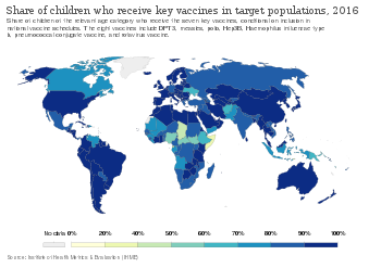 The World Health Organization (WHO) estimate that vaccination averts 2–3 million deaths per year (in all age groups), and up to 1.5 million children die each year due to diseases that could have been prevented by vaccination.[60] They estimate that 29% of deaths of children under five years old in 2013 were vaccine preventable. In other developing parts of the world, they are faced with the challenge of having a decreased availability of resources and vaccinations. Countries such as those in Sub-Saharan Africa cannot afford to provide the full range of childhood vaccinations.[61]
