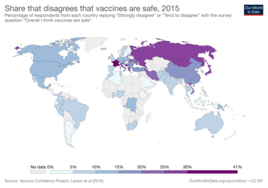 Various disputes have arisen over the morality, ethics, effectiveness, and safety of vaccination. Some vaccination critics say that vaccines are ineffective against disease[100] or that vaccine safety studies are inadequate.[100] Some religious groups do not allow vaccination,[101] and some political groups oppose mandatory vaccination on the grounds of individual liberty.[82] In response, concern has been raised that spreading unfounded information about the medical risks of vaccines increases rates of life-threatening infections, not only in the children whose parents refused vaccinations, but also in those who cannot be vaccinated due to age or immunodeficiency, who could contract infections from unvaccinated carriers (see herd immunity).[102] Some parents believe vaccinations cause autism, although there is no scientific evidence to support this idea.[103] In 2011, Andrew Wakefield, a leading proponent of the theory that MMR vaccine causes autism, was found to have been financially motivated to falsify research data and was subsequently stripped of his medical license.[104] In the United States people who refuse vaccines for non-medical reasons have made up a large percentage of the cases of measles, and subsequent cases of permanent hearing loss and death caused by the disease.[105]