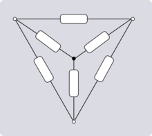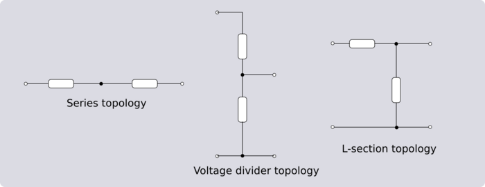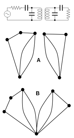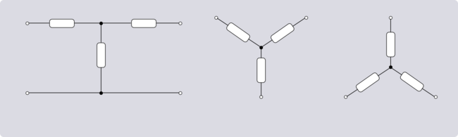 Many topology names relate to their appearance when drawn diagrammatically. Most circuits can be drawn in a variety of ways and consequently have a variety of names. For instance, the three circuits shown in figure 1.1 all look different but have identical topologies.[2]