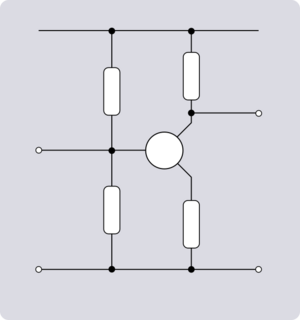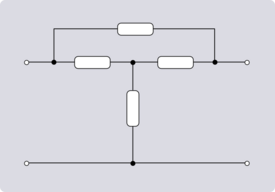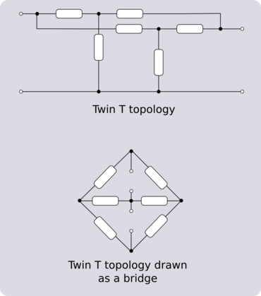There is also a twin-T topology which has practical applications where it is desirable to have the input and output share a common (ground) terminal. This may be, for instance, because the input and output connections are made with co-axial topology. Connecting together an input and output terminal is not allowable with normal bridge topology and for this reason Twin-T is used where a bridge would otherwise be used for balance or null measurement applications. The topology is also used in the twin-T oscillator as a sine wave generator. The lower part of figure 1.11 shows twin-T topology redrawn to emphasise the connection with bridge topology.[8]