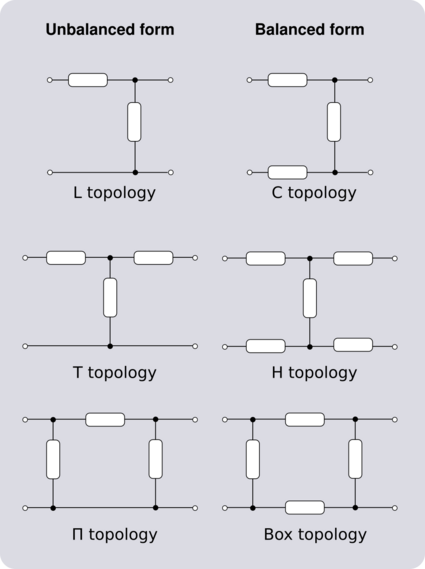 All these topologies can be viewed as a short section of a ladder topology. Longer sections would normally be described as ladder topology. These kinds of circuits are commonly analysed and characterised in terms of a two-port network.[6]