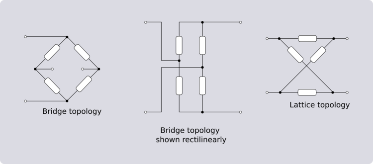 It is normal to call a network bridge topology only if it is being used as a two-port network with the input and output ports each consisting of a pair of diagonally opposite nodes. The box topology in figure 1.7 can be seen to be identical to bridge topology but in the case of the filter the input and output ports are each a pair of adjacent nodes. Sometimes the loading (or null indication) component on the output port of the bridge will be included in the bridge topology as shown in figure 1.9.[7]