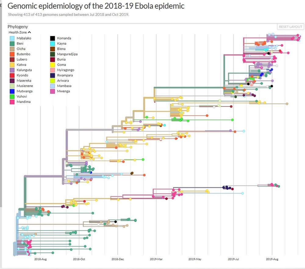 Genomic epidemiology from July 2018 to Oct. 2019 of the Kivu Ebola epidemic.[276] (One of the first sequence:[277] BEN164, health zone: Mabalako, divergence: 5.285e-5, date: 10/08/18, no nucleotide mutations, to its spread to Goma, sequence: GOM1887, health zone: [aforementioned] Goma, divergence: 2.062e-3, date: 7/13/19, nucleotide mutations: A3376G T3378C C3380A T3386A G3388C G3389T T3391C G3398A C3399A, AA mutations: VP35 V87A Q88K L901 to the more recent sequence: MAN9501, health zone: Mandima, divergence: 1.4803-4, date: 10/10/19, no nucleotide mutations[278] This does not reflect the possible final sequence or information, however as of Oct. 2019 the outbreak was slowing down.[279])