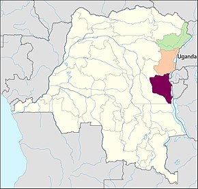 Map of the Democratic Republic of the Congo; North Kivu (orange, middle) South Kivu (dark red, bottom) and Ituri (green, top)