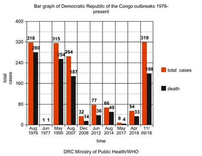↑ 1.01.11.2...in the Congolese statistics cases of Mabalako. Uganda's index case and 7 other family members were classified in Mabalako, the health zone where they started to develop symptoms. Of these 8 confirmed cases of the same family, 5 remained in the DRC and 3 had crossed the border. [...] The 2 deaths of Bwera are the 5-year-old boy and the 50-year-old grandmother who were classified...[8]