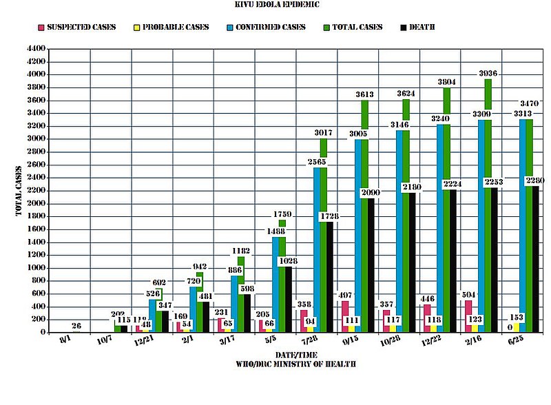 As indicated below and per numbers offered by the United Nations the final death toll was 2,280 with a total of 3,470 cases in DRC in almost a two year period. This was made very difficult due to the ongoing military attacks in the region which created a perfect storm for the virus, despite there being a vaccine.[38] rVSV-ZEBOV or Ebola Zaire vaccine live, is a vaccine that prevents Ebola caused by the Zaire ebolavirus.[39] The graph of reported cases reflects cases that were not able to have a laboratory test sample before burial as probable cases.[40]
