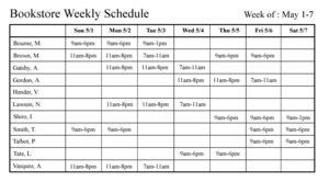 A schedule, often called a rota or roster, is a list of employees, and associated information e.g. location, department, working times, responsibilities for a given time period e.g. week, month or sports season.