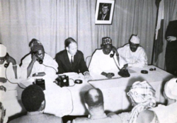 Kingsport sailed to Lagos, Nigeria after Syncom 2 had been successfully launched on 26 July 1963 to serve as the terminal control station during testing and evaluation of the satellite.[1] On 23 August 1963, President John F. Kennedy in Washington, D.C., telephoned Nigerian Prime Minister Abubakar Balewa aboard the Kingsport docked in Lagos Harbor via Syncom 2, the first geosynchronous communication satellite. It was the first live two-way call between heads of state by satellite.[11][12] Syncom 2 and Relay 1 linked Nigeria, Brazil and the United States with Kingsport transmitting through Syncom 2 to New Jersey and New Jersey via Relay 1 to Rio de Janeiro.[13] During this period Gulf of Guinea oceanographic data, composed of depths temperature and salinity from a 1,000 metres (3,300 ft) station, were transmitted from the RV Geronimo to the National Oceanographic Data Center via Kingsport and Syncom 2.[14]