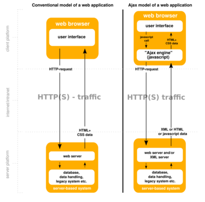 Ajax (also AJAX /ˈeɪdʒæks/; short for "Asynchronous JavaScript and XML" or "Asynchronous JavaScript transfer (x-fer)"[1][2]) is a set of web development techniques that uses various web technologies on the client-side to create asynchronous web applications. With Ajax, web applications can send and retrieve data from a server asynchronously (in the background) without interfering with the display and behaviour of the existing page. By decoupling the data interchange layer from the presentation layer, Ajax allows web pages and, by extension, web applications, to change content dynamically without the need to reload the entire page.[3] In practice, modern implementations commonly utilize JSON instead of XML.