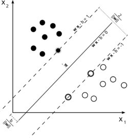 Support-vector machines (SVMs), also known as support-vector networks, are a set of related supervised learning methods used for classification and regression. Given a set of training examples, each marked as belonging to one of two categories, an SVM training algorithm builds a model that predicts whether a new example falls into one category.[74] An SVM training algorithm is a non-probabilistic, binary, linear classifier, although methods such as Platt scaling exist to use SVM in a probabilistic classification setting. In addition to performing linear classification, SVMs can efficiently perform a non-linear classification using what is called the kernel trick, implicitly mapping their inputs into high-dimensional feature spaces.
