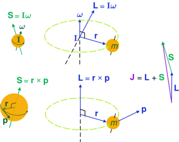 | Angular momentum about a position point r0, | L, J, S | [math]\displaystyle{ \mathbf{L} = \left ( \mathbf{r} - \mathbf{r}_0 \right ) \times \mathbf{p} }[/math]