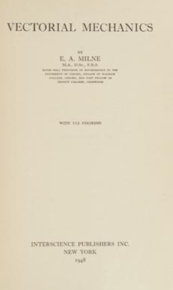 Vectorial Mechanics (1948) is a book on vector manipulation (i.e., vector methods) by Edward Arthur Milne, a highly decorated (e.g., James Scott Prize Lectureship) British astrophysicist and mathematician. Milne states that the text was due to conversations (circa 1924) with his then-colleague and erstwhile teacher Sydney Chapman who viewed vectors not merely as a pretty toy but as a powerful weapon of applied mathematics. Milne states that he did not at first believe Chapman, holding on to the idea that "vectors were like a pocket-rule, which needs to be unfolded before it can be applied and used." In time, however, Milne convinces himself that Chapman was right.[1]