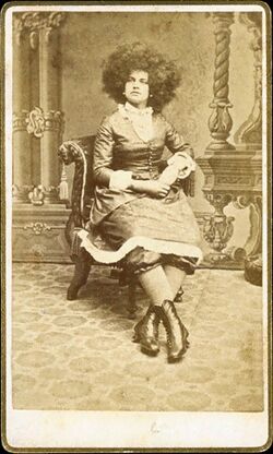 In the 1860s the showman P. T. Barnum exhibited women who he claimed were Circassian beauties. They wore a distinctive curly, big hair style, which had no precedent in earlier portrayals of Circassians, but which was soon copied by other female performers in the United States, who became known as "moss-haired girls". This hair style was a sort of exhibit's trademark and was achieved by washing the hair of women in beer, drying it and then teasing it.[2] It is not clear why Barnum chose this hairstyle. It may have been a reference to the Circassian fur hat, rather than the hair.