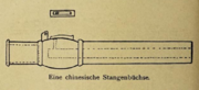 Drawing of a Chinese pole gun found in Java, 1421. It weighed 2.252 kg, length of 357 mm, and caliber of 16 mm. This gun features a rain cover connected with hinge, which is now missing. The hinge is still preserved.