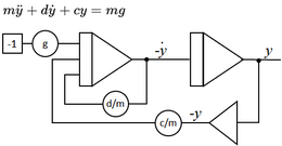 Electronic analog computers are especially well-suited to representing situations described by differential equations. Historically, they were often used when a system of differential equations proved very difficult to solve by traditional means. As a simple example, the dynamics of a spring-mass system can be described by the equation [math]\displaystyle{ m \ddot y + d \dot y +cy = mg }[/math], with [math]\displaystyle{ y }[/math] as the vertical position of a mass [math]\displaystyle{ m }[/math], [math]\displaystyle{ d }[/math] the damping coefficient, [math]\displaystyle{ c }[/math] the spring constant and [math]\displaystyle{ g }[/math] the gravity of Earth. For analog computing, the equation is programmed as [math]\displaystyle{ \ddot y = - \tfrac{d}{m} \dot y - \tfrac{c}{m} y - g }[/math]. The equivalent analog circuit consists of two integrators for the state variables [math]\displaystyle{ -\dot y }[/math] (speed) and [math]\displaystyle{ y }[/math] (position), one inverter, and three potentiometers.