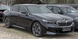 The BMW G60/G61/G68 is the eighth generation of the 5 Series. It was revealed on May 24, 2023,[21][22] and will commence production in summer at BMW's Dingolfing Plant in 2023, with first deliveries beginning around October 2023.[23] The fastback 6 Series Gran Turismo model has been discontinued. The 5-series will be offered in 530i, 540i, and 550e trims, with the 530i containing a 255-hp turbocharged 2.0-liter four-cylinder, offered with rear or all wheel drive. The 540i is standard with all-wheel drive as well as a 375-hp turbocharged inline-six engine. All variants—excluding the plug-in hybrid variants—feature a 48-volt mild hybrid system; this system consists of a 20 Ah lithium-ion and an electric motor/integrated starter-generator rated at 13 kW (17 hp) and 200 N⋅m (150 lbf⋅ft). The 5 Series is claimed to be powerful enough to hit 60 miles per hour in 4.5 seconds by BMW.[24]