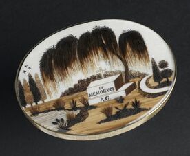 The practice of using hair as mourning jewellery forms part of the Victorian relic culture. The idea of incorporating hair strands into jewellery is a method of materialising the mourning process. Hair is incorporated into jewellery as a memento, considering it is the only part of the body that does not change or decay after death.[8] The use of hair jewellery stems from the material need to create an emotional connection with the departed, even beyond the grave.[7] Hair was considered a versatile material that was incorporated into a variety of jewellery. Hair was commonly interwoven into bracelets, earrings, brooches, rings and watch chains.[7] Materials such as pearls, gold, gems and enamels were commonly added to hair jewellery as decoration.[7] A common use for hair jewellery was to acknowledge and remember the departed and the second use of hair jewellery was to commemorate the departed throughout funeral ceremonies. Funeral ceremonies permitted women to wear specific hair ornaments. Hair ornaments incorporated motifs of skeletons, coffins, angels and crossbones.[9] The use of braided hair was also incorporated in the floral arrangements used at funerals.[9]