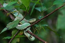 The two-striped forest pit viper is an arboreal snake from the Amazon Basin. An important cause of bites in its habitat, it may be the second most dangerous snake in the Amazon after the common lancehead.[75]