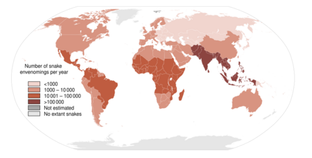 Since reporting is not mandatory in many regions of the world,[1] snakebites often go unreported. Consequently, no accurate study has ever been conducted to determine the frequency of snakebites on the international level. However, some estimates put the number at 1.2 to 5.5 million snakebites, 421,000 envenomings, resulting in perhaps 20,000 deaths, but the actual number of deaths may be as high as 94,000.[7] Many people who survive bites nevertheless suffer from permanent tissue damage caused by venom, leading to disability.[8] Most snake envenomings and fatalities occur in South Asia, Southeast Asia, and sub-Saharan Africa, with India reporting the most snakebite deaths of any country.[1] An analysis cross-referencing exposure to venomous snakes and accessibility of medical treatment identified that 93 million people worldwide are highly vulnerable to dying from snakebite.[9]