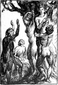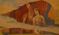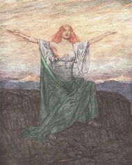 Later in the poem, the völva recounts the events of the Æsir–Vanir War, the war between Vanir and the Æsir, two groups of gods. During this, the first war of the world, Odin flung his spear into the opposing forces of the Vanir.[47] The völva tells Odin that she knows where he has hidden his eye; in the spring Mímisbrunnr, and from it "Mímir drinks mead every morning".[48] After Odin gives her necklaces, she continues to recount more information, including a list of valkyries, referred to as nǫnnor Herians 'the ladies of War Lord'; in other words, the ladies of Odin.[49] In foretelling the events of Ragnarök, the völva predicts the death of Odin; Odin will fight the monstrous wolf Fenrir during the great battle at Ragnarök. Odin will be consumed by the wolf, yet Odin's son Víðarr will avenge him by stabbing the wolf in the heart.[50] After the world is burned and renewed, the surviving and returning gods will meet and recall Odin's deeds and "ancient runes".[51]
