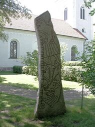 The 11th century Ledberg stone in Sweden, similarly to Thorwald's Cross, features a figure with his foot at the mouth of a four-legged beast, and this may also be a depiction of Odin being devoured by Fenrir at Ragnarök.[81] Below the beast and the man is a depiction of a legless, helmeted man, with his arms in a prostrate position.[81] The Younger Futhark inscription on the stone bears a commonly seen memorial dedication, but is followed by an encoded runic sequence that has been described as "mysterious,"[82] and "an interesting magic formula which is known from all over the ancient Norse world."[81]