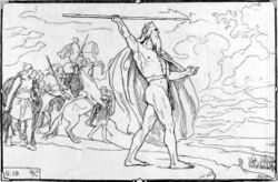 Anthony Birley noted that Odin's apparent identification with Mercury has little to do with Mercury's classical role of being messenger of the gods, but appears to be due to Mercury's role of psychopomp.[24] Other contemporary evidence may also have led to the equation of Odin with Mercury; Odin, like Mercury, may have at this time already been pictured with a staff and hat, may have been considered a trader god, and the two may have been seen as parallel in their roles as wandering deities. But their rankings in their respective religious spheres may have been very different.[25] Also, Tacitus's "among the gods Mercury is the one they principally worship" is an exact quote from Julius Caesar's Commentarii de Bello Gallico (1st century BCE) in which Caesar is referring to the Gauls and not the Germanic peoples. Regarding the Germanic peoples, Caesar states: "[T]hey consider the gods only the ones that they can see, the Sun, Fire and the Moon", which scholars reject as clearly mistaken, regardless of what may have led to the statement.[24]